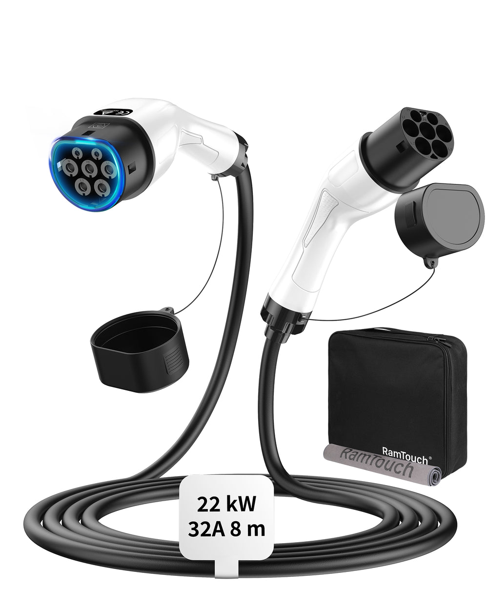 | Ce que vous obtenez | • Câble de charge pour véhicule électrique RamTouch Type 2 (22 kW, 5 m ou 8 m, 32 A, triphasé, mode 3) • Sac de transport durable • Manuel d'utilisation • Sangles Velcro amovibles • Service client amical |
