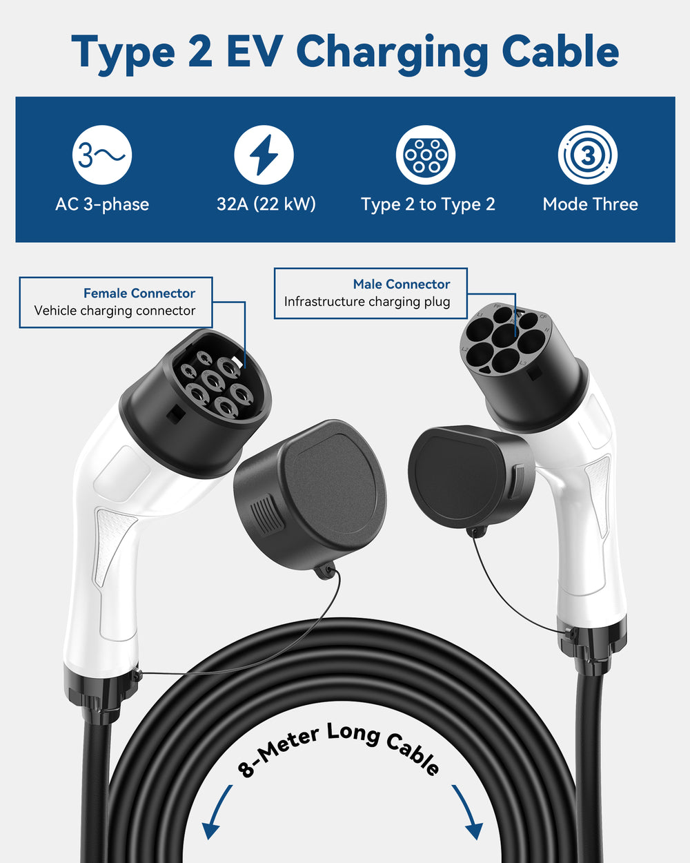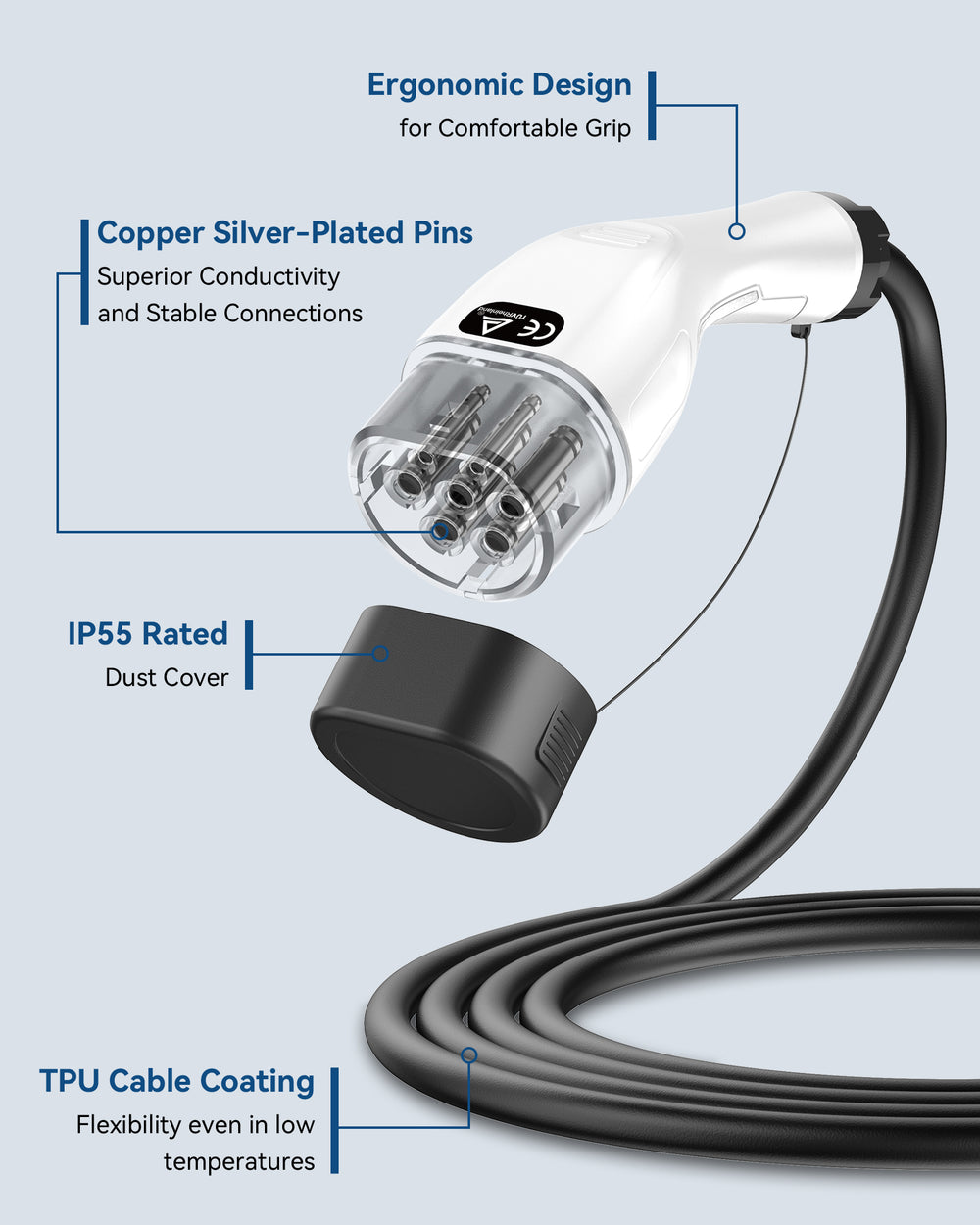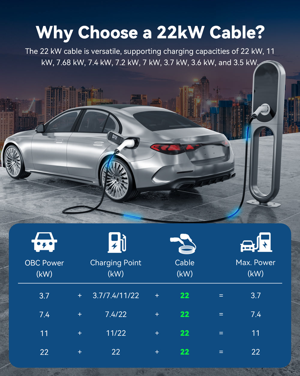 This is a 22 kW (32A, 3-phase) cable, capable of adding up to 130 km of driving range per hour. It also supports lower charging speeds (11 kW, 7.4 kW, 3.7 kW) depending on your car’s onboard charger and the charging station.