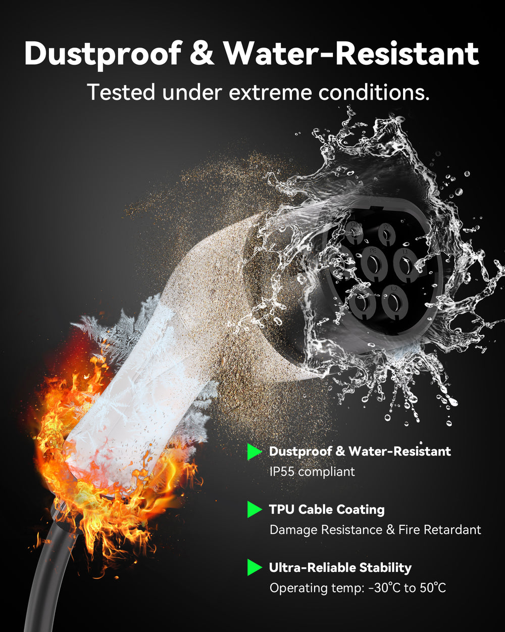 Yes – it is fully compliant with IEC 61851 and IEC 62196 standards. It is IP55 rated (dustproof and water-resistant) and designed for safe, long-term use in all weather conditions.