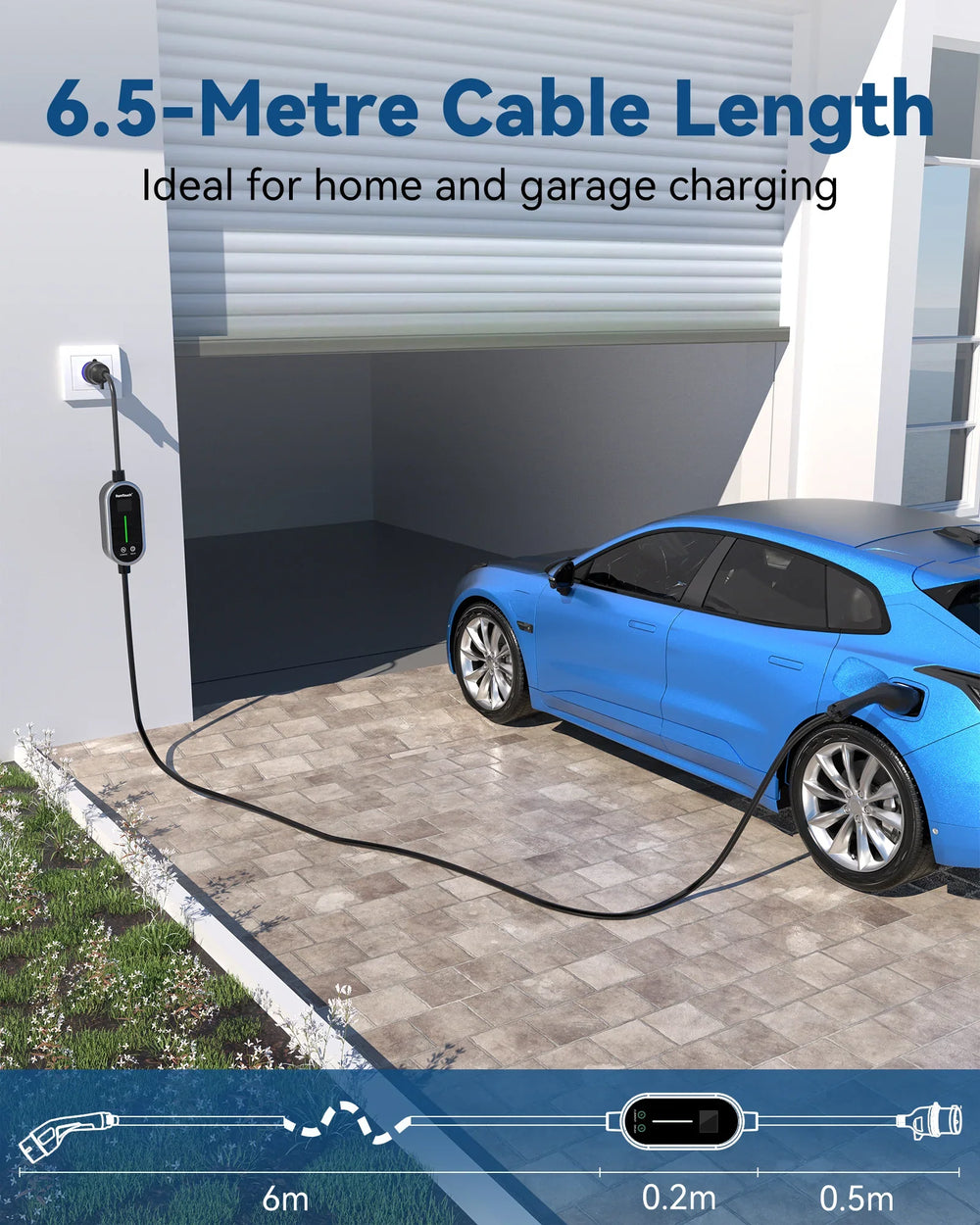 The charger is available with 6.5 m, 10.5 m, or 15.5 m cable lengths. This ensures flexibility depending on your parking layout.
