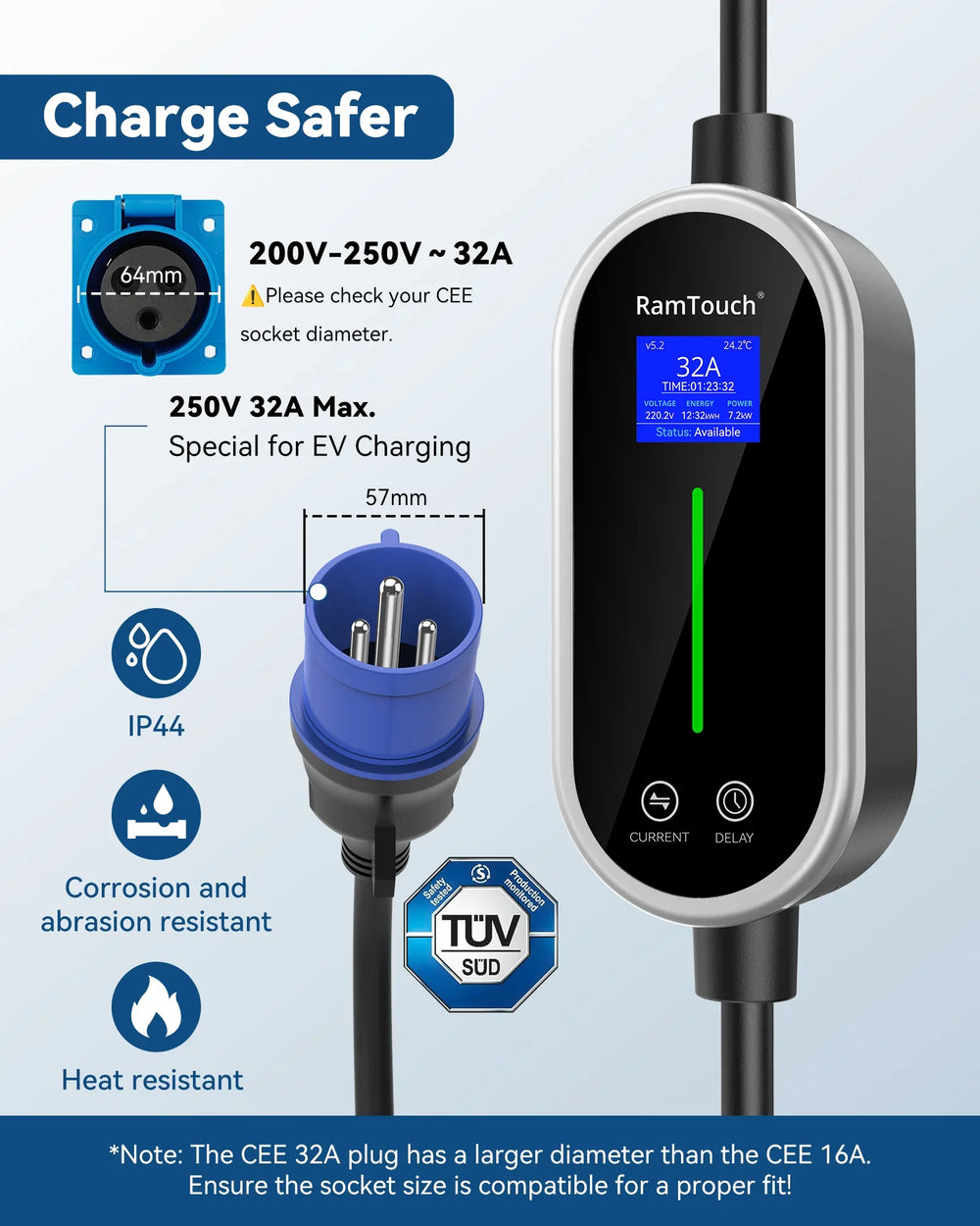 | Compatible with All Type 2 EVs: Designed for a wide range of EVs and hybrids in the UK and EU, this charger boasts a TÜV-certified Type 2 connector and a 32 A CEE plug (32A Commando plug), expertly designed for EV charging to ensure compatibility with CEE 32 A sockets (Diameter approx. 64 mm) |